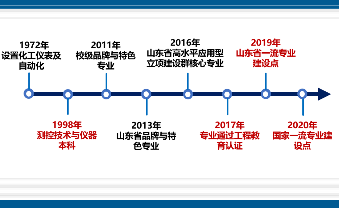测控技术与仪器专业前身为1972年设置的“化工仪表及自动化”专业。1997年招收检测技术及仪器仪表本科生,1998年教育部将仪器学科的所有本科专业统一更名为“测控技术与仪器”。专业成立之初,是为化工行业培养仪表技术人才,随着社会经济的发展,兼具测控技术与仪器仪表领域通才培养。专业经过多年建设,2013年为山东省品牌与特色专业,2016年为山东省高水平应用型专业建设群核心专业,2017年通过工程教育专业认证,2019年为山东省一流本科专业建设点,2020年为国家一流本科专业建设点。