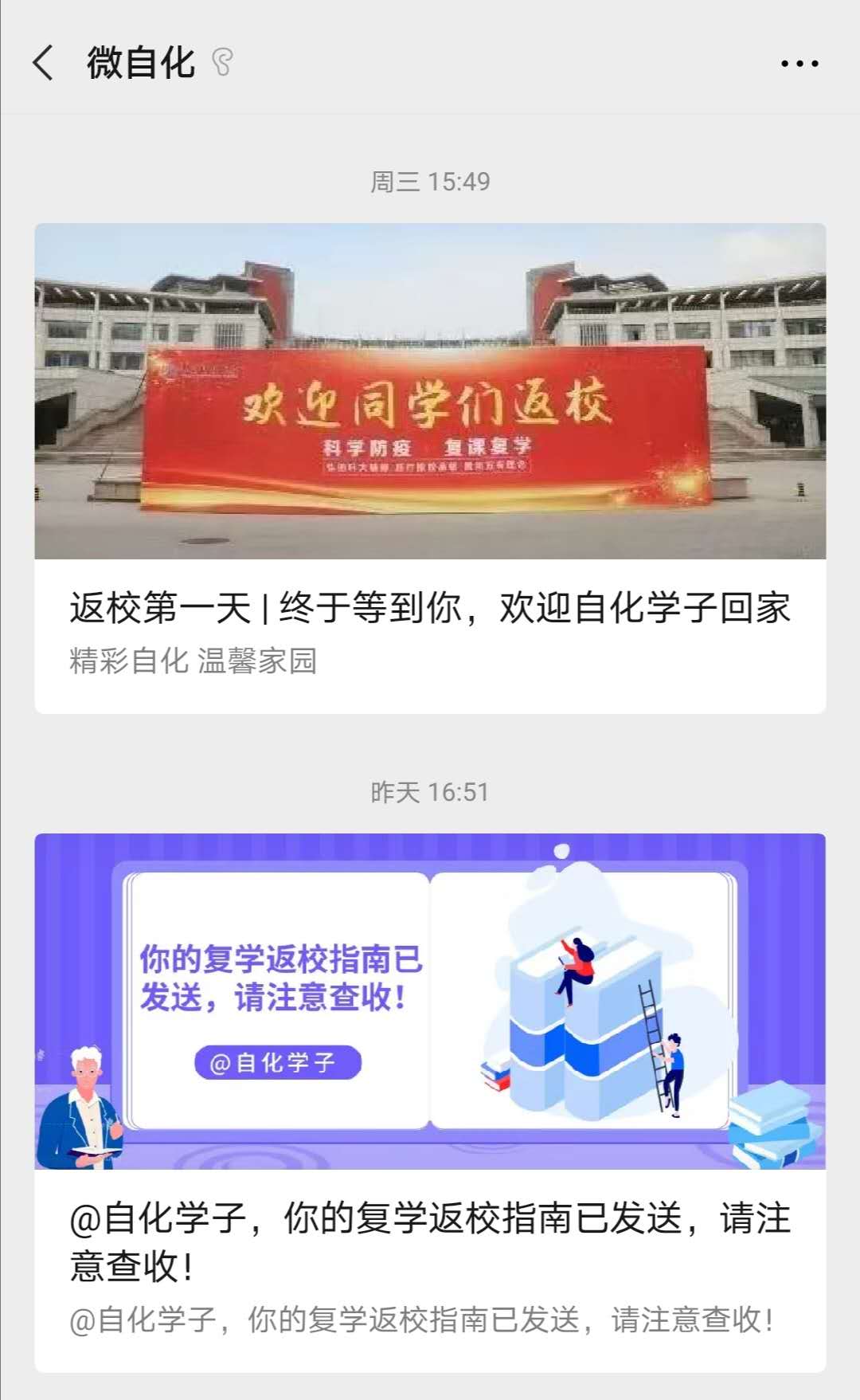 面向全体自化学子,在“微自化”官微推送《复学返校指南》,简洁、清晰地明确了返校每一环节学生需完成的事项,为学生安全、有序回归校园奠定了基础。同时,pg电子平台