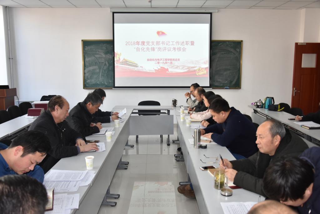 2018年度党支部书记工作述职暨“自化先锋”岗评议考核会在崂山校区D1楼406党建活动室举行,学校纪检监察室副处级纪检监察员赵丰、pg电子平台