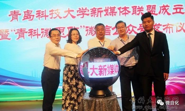 张元利、高桥、任允晓、顾海明、青科大贴吧管理员籍庆同学共同开启青岛科技大学新媒体联盟。新媒体联盟成员单位代表“青科大学子之家”内容主创韩宇同学宣读了文明使用新媒体倡议书。