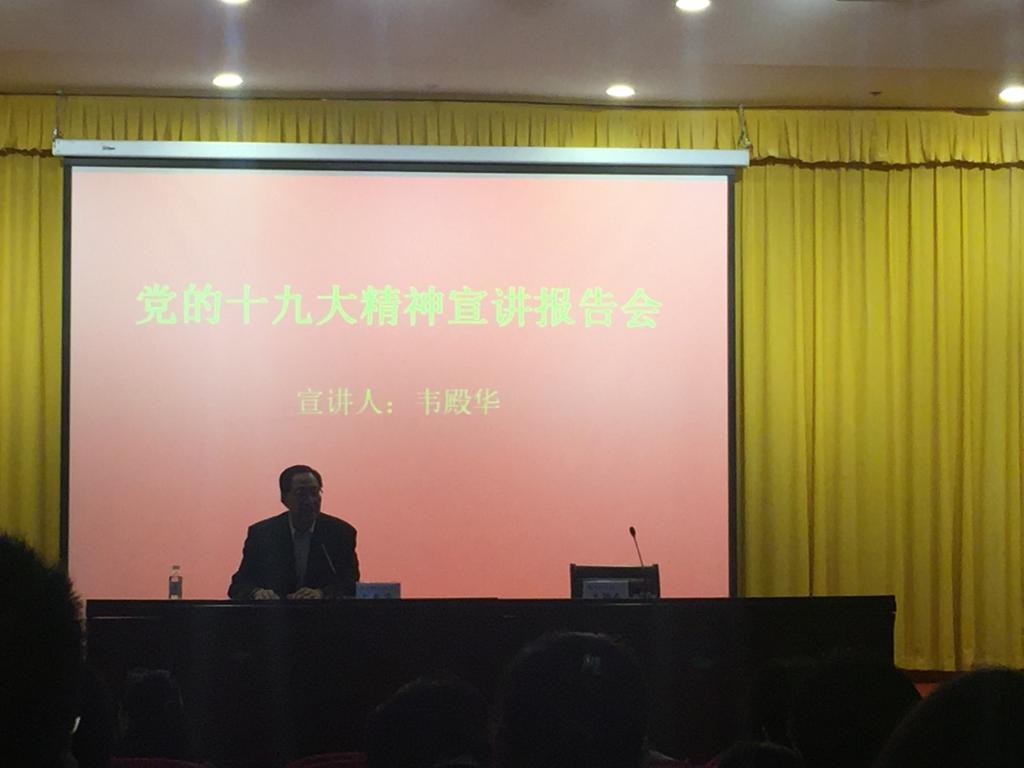 在近2个半小时的讲授中,韦殿华理论联系实际,紧扣党的十九大报告原文,紧紧围绕习近平新时代中国特色社会主义思想这个主线,高屋建瓴、深入浅出地对党的十九大提出的新论断、新要求、新任务作了全面系统而又突出重点的解读。以翔实的数据和大量的案例,全面回顾我国过去五年的历史性成就和历史性变革,系统讲解中国特色社会主义进入新时代,我国社会主要矛盾的变化、“两个一百年”奋斗目标的战略部署、我国经济社会发展重大战略部署以及坚定不移推进全面从严治党等方面内容,并与大家互动交流。