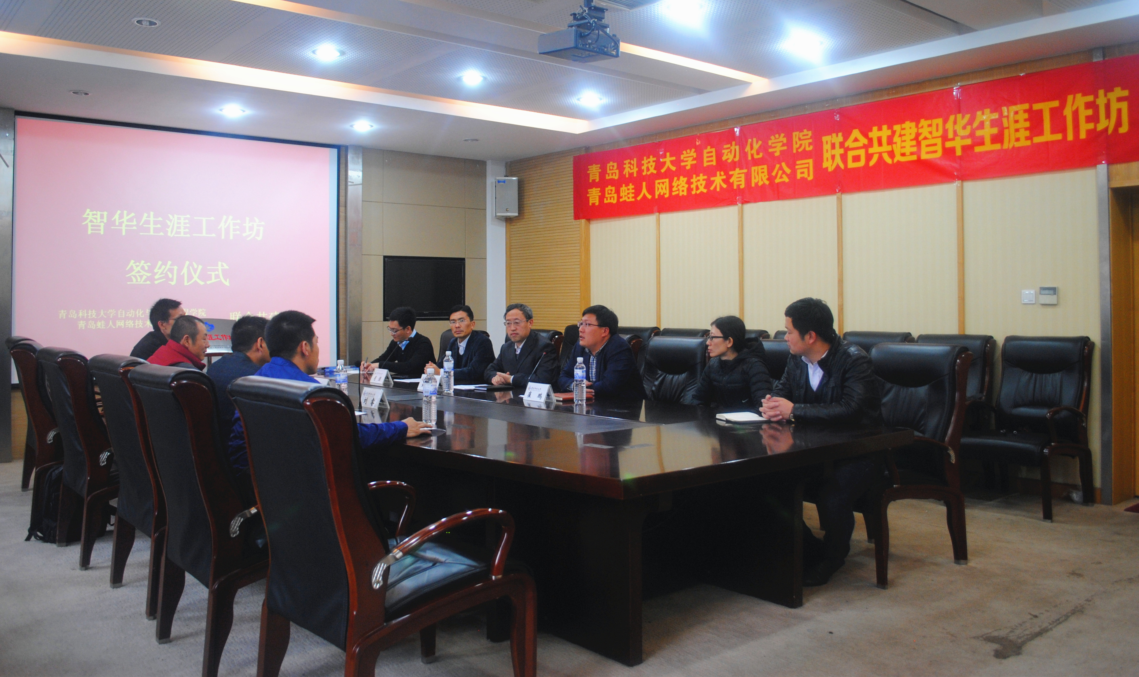 与青岛蛙人网络技术有限公司共建的山东省首家校企合作大学生职业生涯工作坊——“智华生涯工作坊”揭牌仪式在四方校区第一会议室举行。pg电子平台
