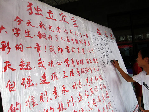的迎新点入口处,有一块醒目的展板,上面印着新生的独立宣言书:“今天,我光荣的成为了一名大学生,翻开了人生最珍贵多彩的一章!我郑重的宣誓:从今天起,我决心学着自理,自立,自主,自强,遵循“文理兼顾,学贯中西”的准则,秉承‘明德,笃学,弘毅,拓新’的校训,追求真理,崇尚科学,遵纪守法,文明修身,团结友爱,勤奋学习,勇于实践,立志成长,誓言做社会主义事业的建设者和接班人,为中华民族的伟大复兴贡献自己的力量!”每一位新生都在独立宣言书上签名,每一笔认真的签名,都透露着他们坚定的决心和满满的信心,透露着他们对未来的展望和期待。家长们都在pg电子平台