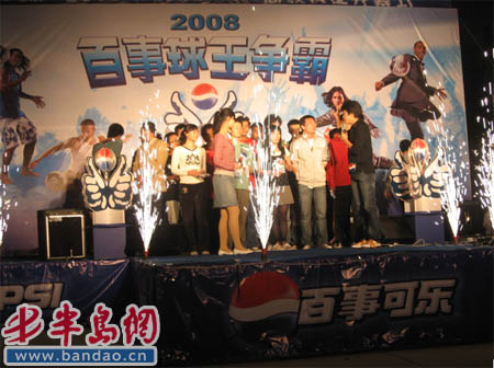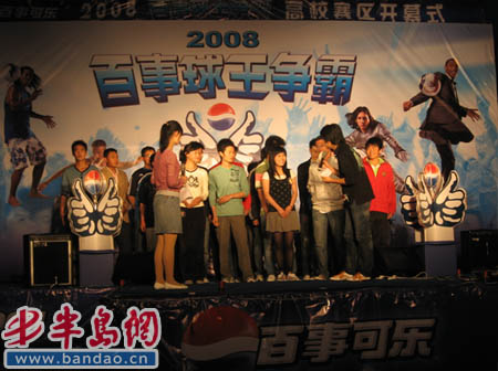主办的“2008舞动中国——百事球王争霸赛” 青岛高校赛区首场开幕式晚会在四方校区小五四广场举行。晚会在force乐队的吉他声中拉开了帷幕,科大幼儿园的小朋友表演的舞蹈《动感智慧树》掀起了晚会的首个高潮。我校青年学生自编自演的的《双截棍》、相声《抬杠》等曲艺节目,深情演绎的《心中的日月 》、《情非得已》、《凌晨三点钟 》、《你是我心内的一首歌》等歌曲节目赢得了观众的热烈掌声,MY组合表演的街舞、运动时装走台秀为整台晚会带来了现代前沿元素,晚会过程中穿插的游戏《抢足球》、《百事传真》活跃了会场的气氛,观众热情高涨。本次“舞动中国” 开幕式晚会丰富了同学们的课余文化生活,提供了一个展现自己的舞台,相信随后进行的赛事会更加精彩。