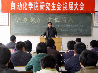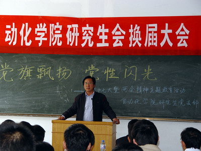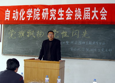 全体研究生参加。上一届院研究生会主席韩雯首先在会上作总结发言,她对上一届院研究生会的工作情况作了认真全面的总结,并谈了自己的工作感言。新一届院研究生会主席宋蓓向大家介绍了院研究生会的成员,并对院研究生会的工作计划作了详细汇报。分团委书记曲斌艳在会上对院研究生会的工作提出了具体要求,并动员全院研究生同心协力一起做好院研究生会的各项工作。副院长童刚在讲话中指出,希望院研究生会充分发挥导师与学生间的桥梁纽带作用,积极开展丰富多彩、特色鲜明的各项活动,增强师生间、同学间的凝聚力;并对同学们所关注的研究生学习要求问题作了详尽解答。院党总支副书记吴汉勇在会上强调,研究生中的中共党员要发挥好模范带头作用,密切配合院研究生会搞好各项活动,要在全院营造出一个良好的学术氛围,同时要求研究生同学要注重提高自身的思想品德素养。校研究生工作部副部长贺伟在会上对院研究生会的工作给予了充分肯定,希望新一届研究生会成员以更饱满的热情,更认真的态度做好今后的各项工作,院研究生会要加强与校研究生工作部的沟通,以便更好地为同学们服务。