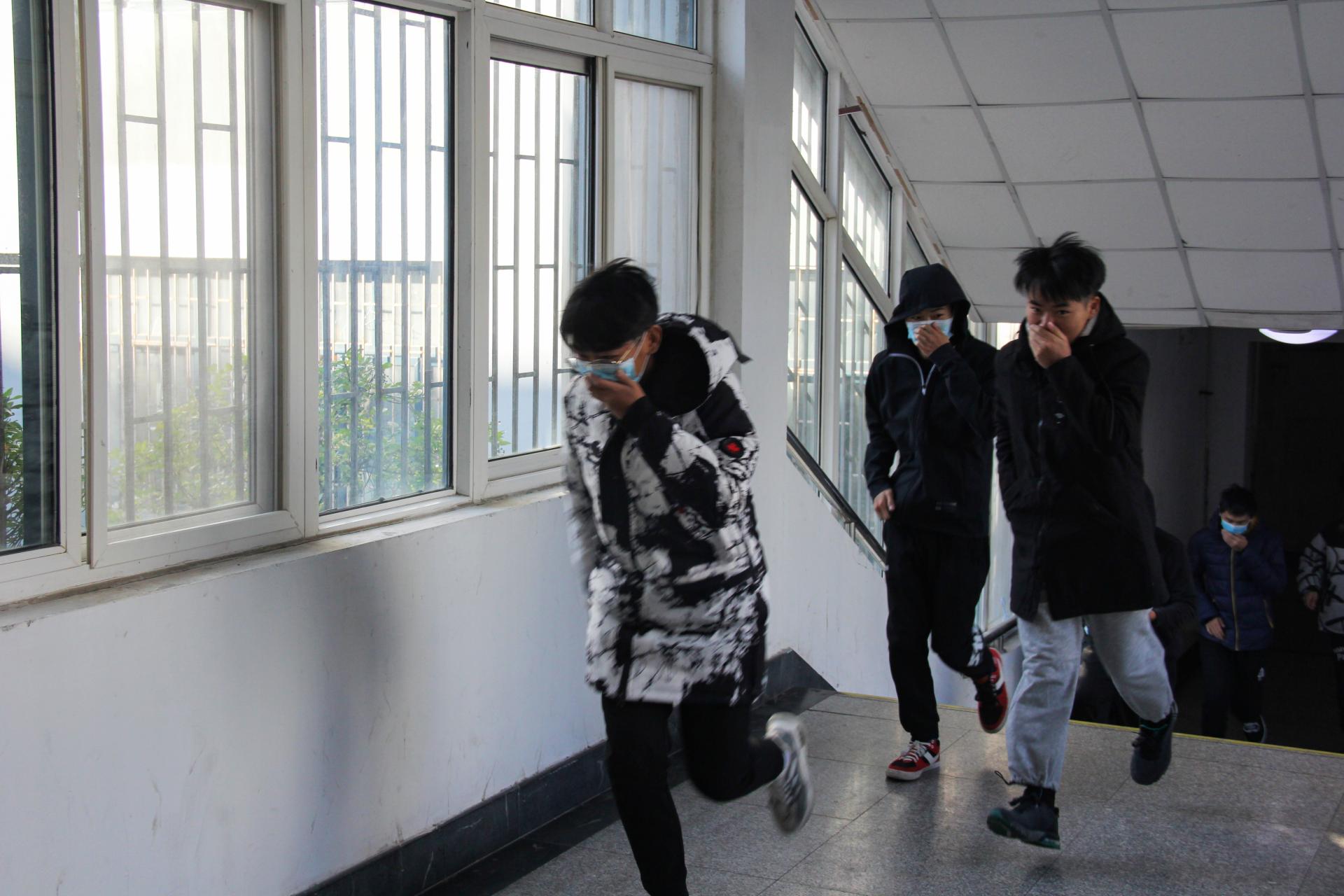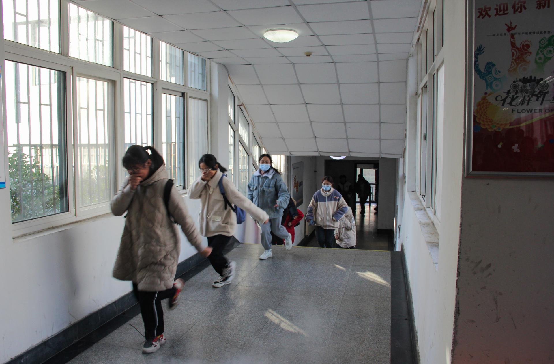 随着警报响起,烟雾弹施放,消防演练正式开始。同学们按照紧急疏散路线,迅速有序地向北苑餐厅平台疏散,在短时间内完成全员安全逃生。