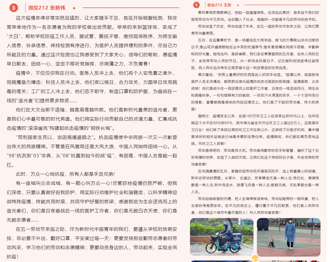 举办“弘扬劳动精神,彰显抗‘疫’决心”线上征稿活动,以文字歌颂最美逆行者,行文间感悟劳动精神,书写最真实的自化“抗疫”故事。