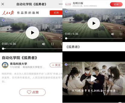 学子积极参与学校五四青年节主题实践团课,音诗画节目《永远跟党走·建功青科大》亮相校迎新晚会,延续开展班歌班徽大赛、宿舍文化节等美育精品活动,同时将网络思政与美育创新融合,设计制作《孤勇者》、《我和我的祖国》等原创视频,获光明日报、齐鲁晚报等社会媒体报道。