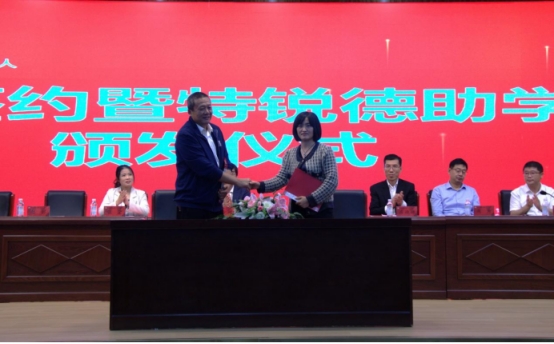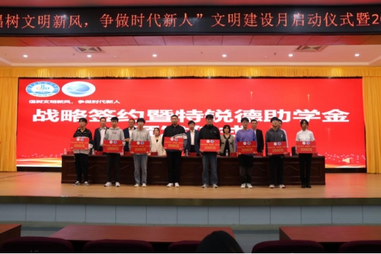会上,与会领导嘉宾为获得首届“特锐德”助学金的同学颁发助学金。