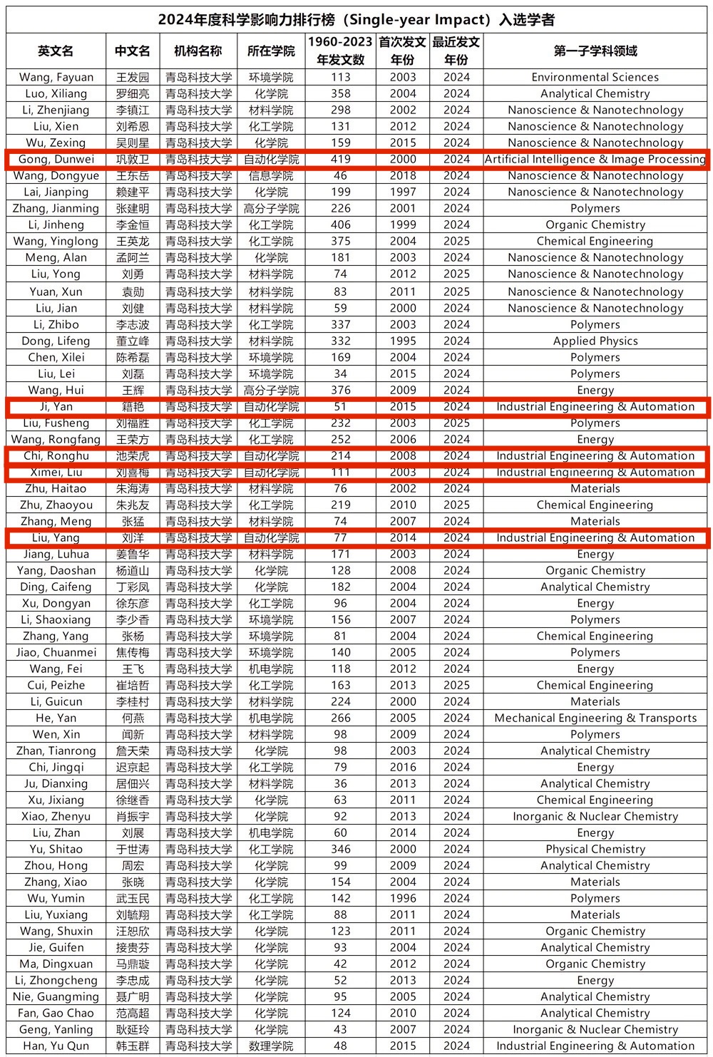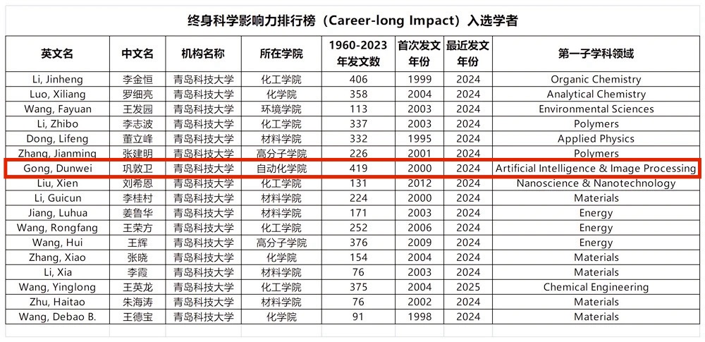 巩敦卫入选全球前2%顶尖科学家——“终身科学影响力排行榜”。巩敦卫、刘喜梅、籍艳、池荣虎、刘洋入选全球前2%顶尖科学家——“年度科学影响力排行榜”。