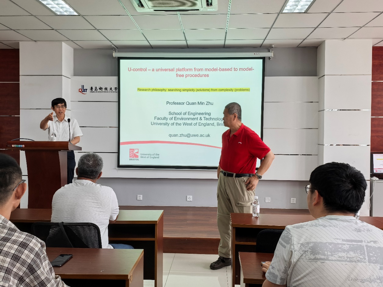 本次报告中,朱教授围绕动态逆控制、无模型滑模控制及线性不变控制器等U型控制中的关键问题进行了深入讲解,并将相关研究基础拓展至其他具有欠驱动模式和强非线性输入特性的系统类型。报告简要阐述了这些控制方法的核心思想、系统架构、算法原理及相关案例研究,引起了参会师生的极大兴趣,并就无模型控制问题展开了热烈讨论。
