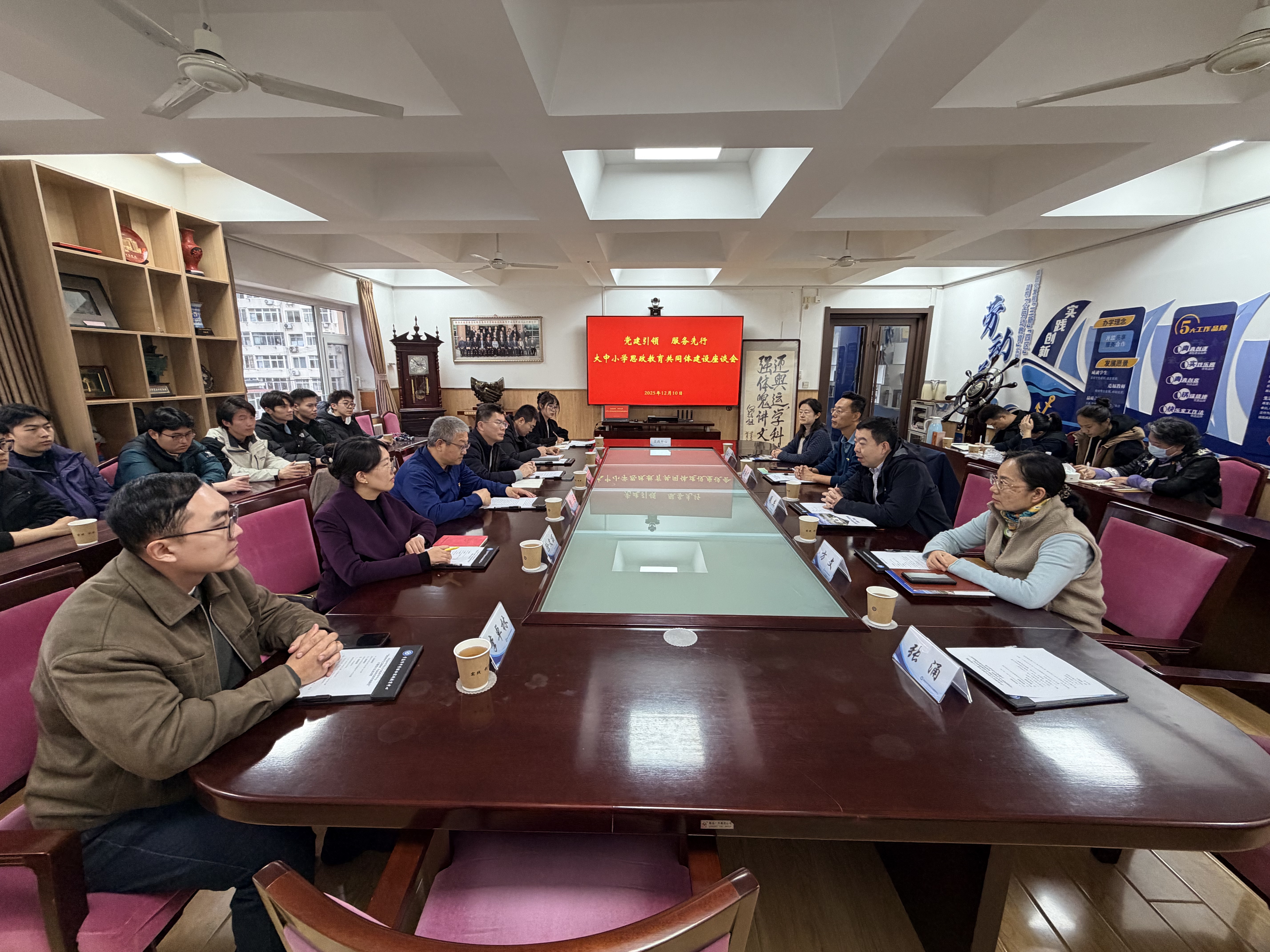 将以更高政治站位、更实工作举措深化合作:一是精准对接高校科研平台、师资力量与中小学实践需求,开发科技与思政深度融合的优质课程;二是建立常态化交流机制,在党建经验互鉴、教学成果共享、师生结对共建等方面持续发力;三是联合申报思政教育与科技教育融合项目,探索可复制推广的青岛特色一体化育人模式。周杰介绍了中心的建设发展、核心职能及办学成效,重点阐述以劳动教育和科技教育为双引擎的育人理念,表达了深化共建合作、共促青少年科技素养提升的坚定意愿。徐永俊介绍了中心党建工作及特色品牌“铁锚精神”:该铁锚曾随海军某重要舰艇服役,参与一系列试验试航和重大演习任务,多次接待军内外首长视察参观,于2003年9月光荣退役,2004年扎根实践中心。中心以此为核心凝练的“铁锚精神”,即敦实的思想作风、扎实的工作作风、朴实的生活作风。
