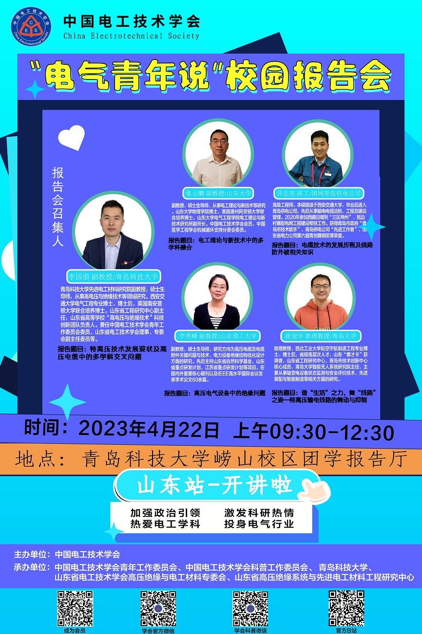 、先进电工材料研究院承办。会议共邀请来自山东大学、山东理工大学、国网青岛供电公司等单位的5位优秀电气工作者做科普报告,欢迎电气工程及相关专业广大师生参加!