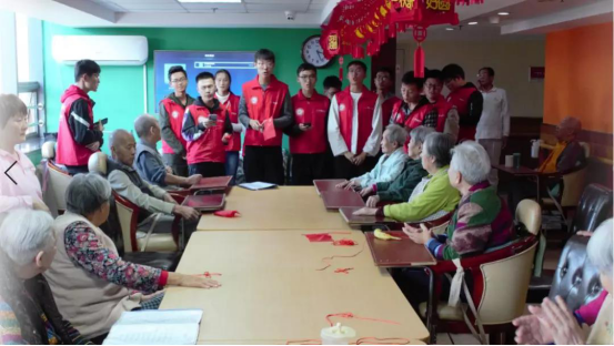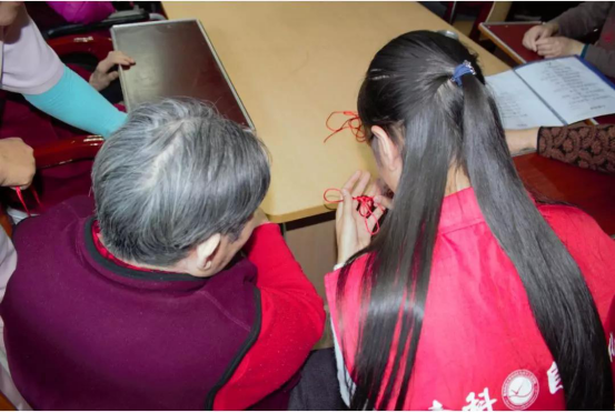 老人们亲切的与义工队员们打着招呼,老人们看见他们就像见到自己孙女、孙子一样高兴,大多数老人都很开朗、健谈,虽然有的老人们听力减退,说话不清,但志愿者们却和老人们聊的很开心,随后志愿者们还教老人们如何编中国结,并将编好的中国结送给老人。