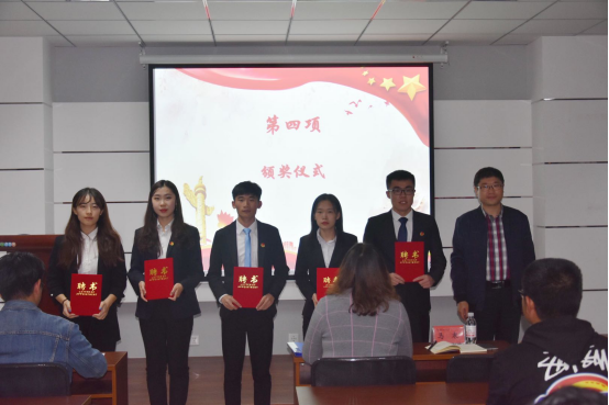 第十六届学生委员会主席团、部长团的决定》。由马寒为新一届主席团成员及部长颁发聘书,郭蒙蒙和王伟欣为新一届部长颁发聘书,于彬为优秀部长颁发荣誉证书,孙晓旭和吴擎为优秀干事颁发荣誉证书,并分别与学生们合影留念。