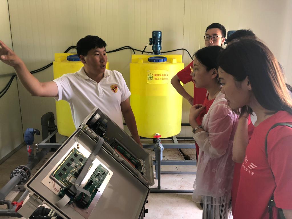 调研团成员在创新园负责人的带领下参观了水肥一体化车间,并在负责人耐心细致的讲解下深入了解到,水肥一体化是将灌溉与施肥融为一体的农业新技术。它通过可控管道系统将水肥相融后,通过发达的输送管道将其运输到各个作物的灌溉区,灌溉区的滴头在作物根部形成滴灌。同时根据不同的农作物的需肥特点、土壤环境和养分含量状况,把水分、养分定时定量、按比例直接提供给农作物。长兴农业园已经将这一技术较为成熟应用到葡萄等农作物的灌溉与施肥上。负责人介绍到:“有了这个技术,灌溉几百亩的地只需要设定好比例,打开开关后让它自己运行就行了。”水肥一体化系统通过创新灌溉方法使长兴农业园真正做到了省肥节水、省工省力。