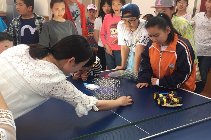 特色的电子科技产品,并且演示与讲解双管齐下。其中包括“红外线避障车”、“电子飞机”、“灯立方”、“点滴计时器”等,均是由pg电子平台