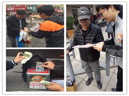 天气虽微凉,但同学们一早准时就在台东三路麦当劳集合完毕,个个精神抖擞,蓄势待发。同学们按照提前分好的小组,于胸前贴好“微尘”的爱心标签,手拿“爱心报”,兴致勃勃的开始了义卖活动。同学们积极努力、不怕失败,即使被婉言谢绝也仍然面带微笑毫不气馁地继续努力着,更有“不怕苦不喊累”的精神,走遍大街小巷努力义卖着。各小组之间无形中似乎也形成了一种“竞争”模式,彼此都争先恐后,使出浑身解数进行义卖,为此次义卖活动增添了不少的乐趣。经过了两个半小时的义卖后,虽然同学们满头大汗,但都乐在其中。义卖结束后,同学们先后返回集合地点,同时将本次义卖的钱全部投入捐款箱中。经过同学们的不懈努力,每个小组全都“果实”丰硕,各位成员也都获得了“微尘”活动的感谢状,其中,第二小组三人更是以骄人的“战绩”荣获了本次活动“义卖冠军”的称号。最终,在同学们的欢声笑语中,本次活动正式划上了一个圆满的句号。