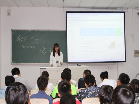 与学生的沟通交流。陈鹏的讲解为新进干事打开了一个更高层面的窗户,不再单单将微信置于“聊天”这一个用途,为干事将来更好的掌握新闻写作技能提供了一条便利之径。随后,王晓萌就微信公众平台简介及其后台运作做了精要介绍;并且向干事们推荐了数个较好微信公众号,供他们学习。最后,王晓萌进一步解答了部分干事对微信略感迷惑的问题,并且分享了自己的使用经验,活跃了现场的气氛,调动了干事的积极性,使彼此之间相互交流了自己对微信的认知和经验。