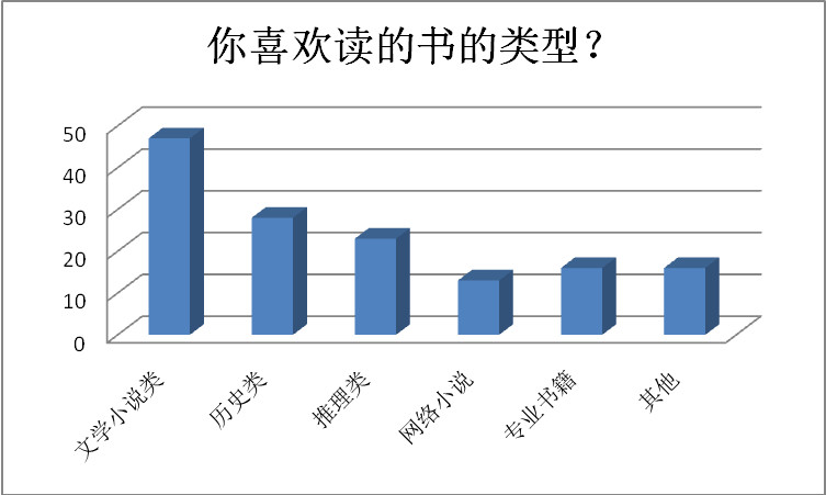 6.市面上图书的类型越来越多,每个人的阅读类型也不尽相同。近一半的同学相对喜欢文学小说。历史类和推理类也相对受欢迎,一部分人会选择专业书籍进行学习。可以看出大部分人读书都会选择休闲或历史类读物,用来放松自己丰富自己。