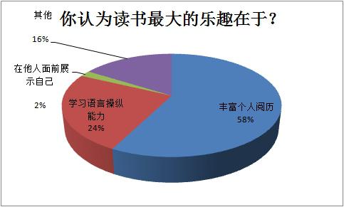 3.对于读书的乐趣,58%的人认为丰富了个人经历,24%的同学认为学习语言操纵能力也很重要。只有2%的人认为在他人面前展示自己是读书的乐趣。由此可见,我们并不是为了别人而读书,是为了自己而读书,“腹有诗书气自华”,丰富自己的内心世界,让我们更加有气质有内涵。