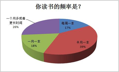1.从读书频率看,每周一本和每月一本的人数差别不大,39%的人半月读一本书,还有26%的人则用更长时间。由此看出大部分人可以保证自己的阅读量,而小部分人还缺少对图书的需求。