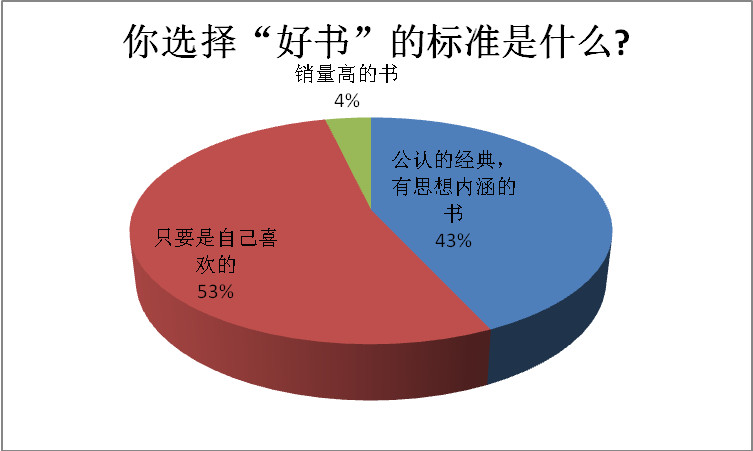 3.在选择阅读对象的问题上,同学们更倾向于根据个人兴趣选择。许多经典名著由于年代、题材的问题,无法引起大学生的阅读兴趣。而当今大学生有普遍存在“懒散“的思想状态,不愿啃硬骨头,不愿钻研。诚然,兴趣是第一导师。但是当下有些文学作品只愿迎合年轻人的浮躁心态而没有展现良好的文学价值,对待这种作品,兴趣就决不能成为唯一的度量标准。
