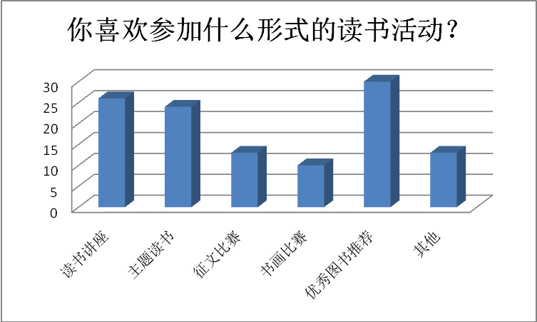 6.绝大多数同学对读书讲座更加渴望,说明同学们缺乏阅读技巧与文化常识,这是妨碍阅读过程的硬伤,同学们迫切的需要一个专门的讲座提升这方面的能力。