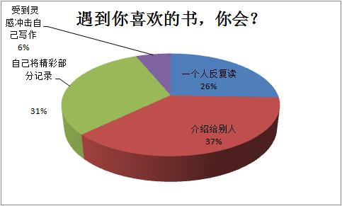 2.在遇到自己喜欢的图书时,大部分人选择介绍给别人阅读或者自己反复阅读,一小部分人会将精彩的部分记录下来,只有6%的人会受到灵感冲击自己写作。“好记性不如烂笔头”,多做记录才能让我们受益更多,进行创作则能让灵感真正属于自己为自己所用。