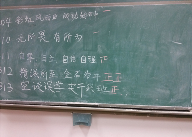 班训方面:204宿舍提出“彩虹风雨中,成就细节中”。她们希望我们能注重成功的细节。310宿舍提出“无所畏,有所为”。他们认为我们应该有一种敢于向前冲的气势,才能取得一定的成就。311宿舍提出“自尊、自主、自信、自强”。他们认为我们要牢记这“四个自”,不断提高自我,才能让自己和班级取得最后的成功。313宿舍提出“空谈误学,实干兴班”。他们认为只有真正脚踏实地地去做,才能取得成功。最终,经过全班同学的推选,将313宿舍提出的“空谈误学,实干兴班”定为本班班训。