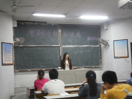 然后,张如美为大家讲解关于考研的相关问题。张如美首先说了考研的重要性,考研可以缓解就业压力,可以增加就业砝码。接着张如美就考研复习阶段进行了重点讲解,在大家确定了学校和专业以后,就要收集相关的复习资料。首先,从所选学校的网站找到招生简章和专业目录,上面有具体的专业和专业的指定参考书目。其次,就是找到历年真题,进行反复练习。她建议大家在确定的学校联系一个本学校的校友,借用他的学习资料,这样可以事半功倍。最后张如美留下了自己的联系方式,以便和大家及时交流。