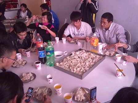 下午2:00包饺子活动正式开始。同学们分成3组,每组都是男女搭配组成,比赛开始后同学们忙的热火朝天,但是忙而不乱,分工明确,男同学负责擀皮,女同学负责包水饺,配合默契。很快,饺子包好了,尽管展现在我们面前的饺子奇形怪状,但这也是同学们辛勤劳动的结果。接下来是煮水饺了,同学们把水饺放到沸腾着的热水里,不一会,热腾腾的饺子就煮好了。同学们一边吃饺子,一边举行了各种互动游戏:相互喂水饺,吃水饺比赛,还有歌曲对唱等,屋里充满欢声笑语。