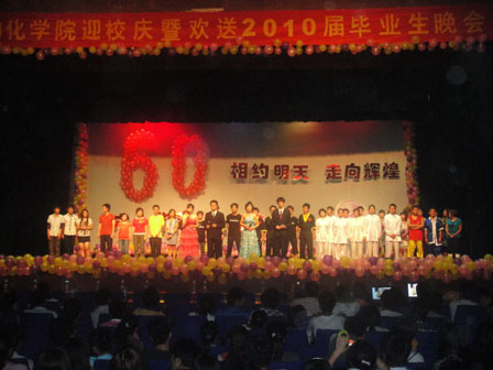 秋菊溢金,丹桂飘香,2010届毕业生离校之际,母校即将迎来60周年华诞。6月7日晚上,pg电子平台 在西礼堂举行迎校庆暨欢送2010届毕业生晚会。学生处副处长吴向东、后勤处副处长王江忠、校团委副书记曲慧敏、化工pg电子平台 党总支副书记曲斌艳、pg电子平台 领导王培山、刘喜梅、童刚、肖强及pg电子平台 分团委各位老师和兄弟院系分团委老师参加晚会,pg电子平台 全体师生观看了此次晚会。
