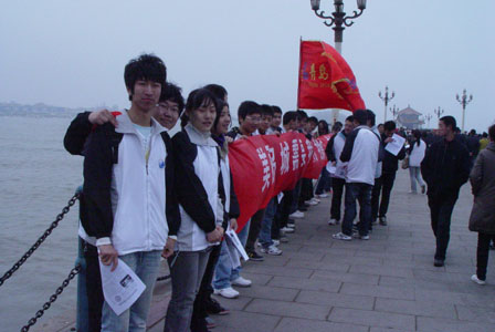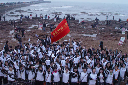 楼下集合。首先,活动的负责人宣布了活动的具体内容:先是乘坐公交车到达栈桥,在栈桥开展宣传环保的活动,再从栈桥徒步走到中山公园。然后,大队开始浩浩荡荡的向栈桥进发,大家分乘三班车到达栈桥。接着,大家开始在栈桥组织活动。大家先是集合起来拍张照,之后活动的全体成员分成两组,一组负责在栈桥上宣传环保,一组负责到海边捡垃圾。在栈桥上,大家拉起了一个印有青岛科技大学字样的横幅,同学们开始向游人发一面宣传环保一面介绍青岛科技大学的传单,同时邀请游人在横幅上签下自己的名字。许多游人在横幅上写下自已的名字表达自己对环保事业的支持,横幅上留下了不同年龄,不同肤色,不同语言的人的名字。在海边,同学们踏实工作,用纸做的或者布做的袋子,捡起游人随意丢弃的垃圾,同学们在弯腰俯首之间,展现出热爱环保事业的青科大学子的风采。中午十二点,大家离开栈桥,说笑着徒步向鲁迅公园进发。到达鲁迅公园后,大家分开,五人或者十人一组开始吃午饭。午饭时,大家仍是趣味不断,大家或是聚在一起欣赏文艺部的同学奉上的动听的歌曲,或是来到海边感受海的狂澜。之后,大家离开鲁迅公园,又徒步行走到中山公园。一路上,歌声笑声相随,大家虽然累,但很快乐。最后,大家在中山公园门口合影留念,集体活动结束,同学自行游览中山公园。三月的公园生机盎然,大家三五成群,欣赏了公园里含苞待放的灿然樱花。