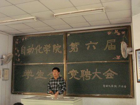 换届选举大会正式开始,主持人闫凤丹宣布竞选流程,参与此次竞选的学生会成员认真聆听着竞选规则,大家脸上洋溢着自信的笑容。按规则,竞选主席团的成员有三分钟的演讲时间,而竞选部长的干事有两分钟的发言时间。首先,竞选主席团的各部部长们主动上台演讲,他们锐意的思想、幽默的谈吐征服在场的同学,教室里时时响起热烈的掌声。随后,竞选部长的干事上台演讲,他们饱满的热情和总结的经验赢得了领导老师的点头赞许。最后,刘名森老师对此次竞选大会进行了总结,作为学生会的负责人,刘老师为这次学生会的换届选举做了大量筹备工作,他首先对大家参与学生会的热情表示赞许,然后勉励大家要将学习放在首位,在完成学习任务的基础上搞好工作,最后他预祝此次换届选举大会取得圆满成功。会议在大家如潮般的掌声中落下帷幕。