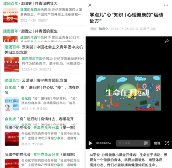 自动化专业和学科特色。学生特色活动在新媒体平台专栏化、板块化宣传报道,增加影、音、图、画、文的内容输出和价值供给。以“学点儿‘心’知识”、“青年党员云分享”等系列作品为代表的专题“云”课堂广受好评;读团史、答百题、云游览、学先进等专栏将音、图、画有机统一在网络思政作品中,由专题教育衍生系列“云”学习;组织专业教师、“科创之星”、“领航学长”等深入挖掘、提炼专业学习要领和科创竞赛经验,话感悟、谈经验,将思想政治教育融入专业培养。切实把“网络+品牌”做深做强,引导学生主动参与 “云课堂”和“云研究”,实现了思想和价值的双重引领。