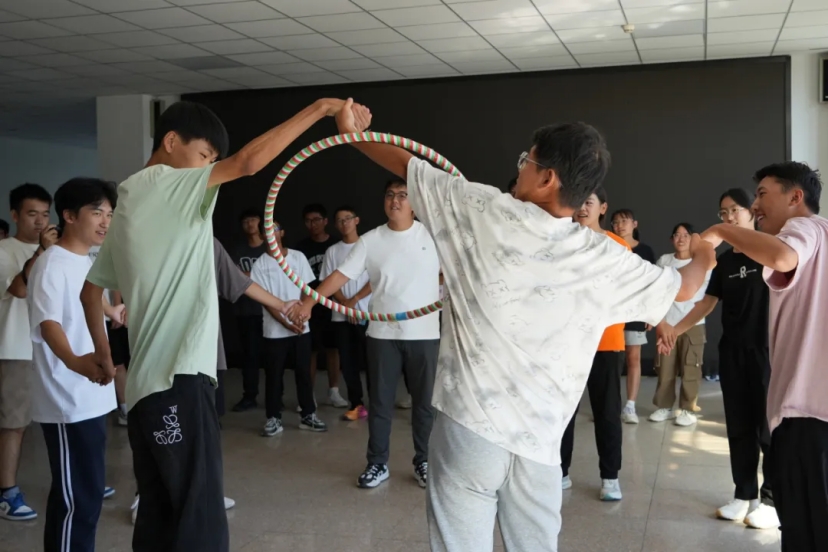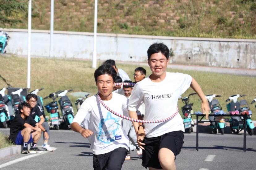 呼啦圈传递项目迅速点燃了现场的气氛。伴随着欢快的音乐节奏,呼啦圈在参与者间流畅传递。笑容与欢呼声交织,空气中弥漫着浓厚的团队协作带来的欢笑。