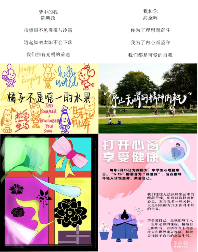 本次活动期间,同学们积极投稿,踊跃参与,收到多份来自各年级学生的作品。同学们的参赛作品形式多样,内容丰富多彩,包括心理健康宣传视频、心理健康海报、宣传手册、三行诗、书签、绘画、书法等各种形式。